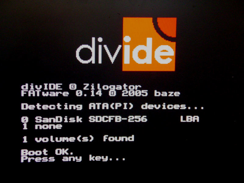 BAZE (author of FATWARE) send me source code of last version FATWARE 0.14 :). Last official release is version 0.12 and all my next modifications is for this old version. And what is new in FATWARE 0.14 ? - 8kB code must be flashed to DIVIDE rom only - after start ZX will fat boot BIN file from directory "FATware" on master device with FAT16(need master boot record) - this fatware use 16kB of code (old version only 8kB) - some TAP files work correct (old FATWARE 0.12 load incorrect data from TAP file with Prince of Persia...) - I don't know about next new features :( Bugs in new FATWARE 0.14: - error chars for sign directory (directory sign as ":" ) - after last file in directory show bad chars (this is only cosmetic errors, browser work correct) Source code is for ZILOG DEVELOPMENT STUDIO and manual for assembly is included in TXT file. :v2_dizzy_roll: FULL SOURCE CODE: http://velesoft.speccy.cz/zx/divide/...01)-source.zip ASSEMBLED FILES: http://velesoft.speccy.cz/zx/divide/...011-05-01).zip http://velesoft.speccy.cz/other/photos/fatware014.JPG Here is actual version with bugs in browser, for testing (without source code): http://velesoft.speccy.cz/zx/divide/...011-05-01).zip You must on master IDE device create directory "FATware" and copy bile "boot.bin" to this directory. Flash new FATWARE from TAP file and restart ZX... Now we have the source codes for systems: - DEMFIR - MDOS 3 - FATWARE - GASWARE And need sources for: - ESXDOS - +DIVIDE - RESIDOS (system for divide with 128kB ram minimum) I have source code for system BS-DOS 309, but it's not free. Author (BUSY alias BUSYSOFT) can send sources, but can't be released. Sources for other IDE UTILS is free (zx fdisk, zx ide info, cd player). All sources can be modified for russian IDE ports (NEMO IDE). After it can be used light version of russian DIVIDE clone with memory only and IDE ports can be russian. |