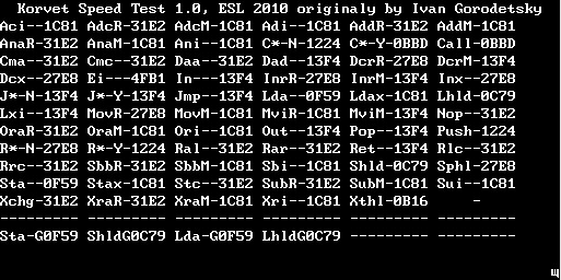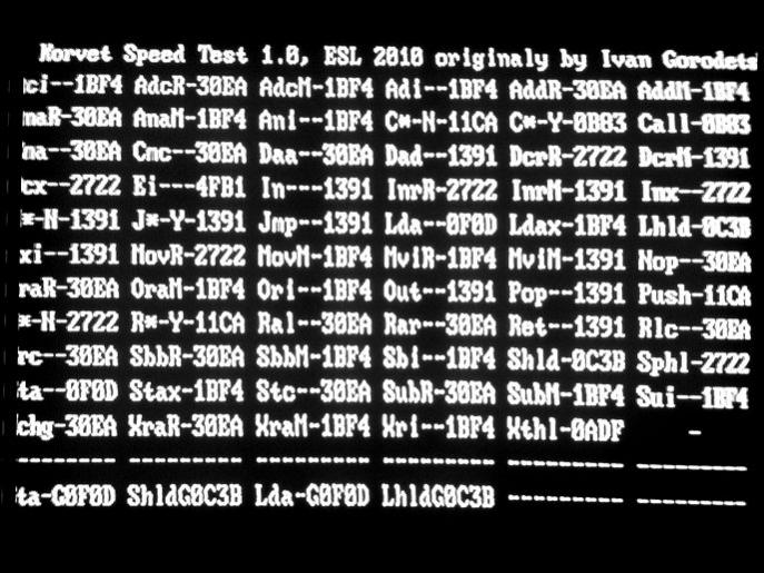 esl, спасибо за результаты с реала. Я не анализировал схему, но судя по всему у Корвета в кадре не 312, а 306 строк. В последнем случае результаты в эмуляторе "почти совпадают", с точностью до пары-тройки команд. Где-то ivagor уже говорил про этот недостаток эмулятора.