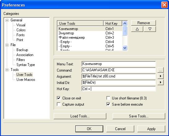 Spectaculator – эмулятор ZX с простым интерфейсом http://trd.speccy.cz/emulz/SPECT701.ZIP эмулятор http://trd.speccy.cz/emulz/SP701PCR.ZIP таблетка Crimson Editor 3.70 Release – обычный текстовый редактор, где непосредственно и будет редактироваться текст программы http://www.crimsoneditor.com/download/cedt370r.exe ASAM Compiler By Rob F. / Entire Group – компилятор нужен для превращения текстового файла в готовый код с созданием образа диска и выгрузкой кодового блока на этот образ Far manager + ZX plugins – файловый менеджер позволяющий редактировать образ *.trd http://zxfiles.ru/downloads.php?id=511 1. Устанавливаем Spectaculator 2. Устанавливаем Crimson Editor 3. Далее прикручиваем к редактору компилятор вызываемый по нажатию Ctrl+1 Tools → Preferences → User Tools (горячие кнопочки) Рис.1 В Menu text пишем название т.е. Компилятор В Command прописываем путь к компилятору В Argument указываем, текущий текстовый файл + .txt и дописываем собственно файл с командами z80.cmd (в пакете с компилятором) В Inital Dir указываем текущую директорию В результате нажатия Ctrl+1 получаем компиляцию (ассемблирование) текстового файла открытого в данный момент и сохраненного в папке с компилятором. 4. Далее прикручиваем к редактору эмулятор вызываемый по нажатию Ctrl+2. Рис.2 В Menu text пишем название т.е. Эмулятор В Command прописываем путь к Эмулятору В Argument указываем образ диска *.trd который будет запущен сразу после загрузки эмулятора В результате нажатия Ctrl+2 получаем запуск эмулятора вместе с *.trd образом диска (в данном случае probe.trd). 5. По такому же принципу на Ctrl+3 навешиваем файл менеджер. В Menu text пишем название т.е. Файл менеджер В Command прописываем путь к Менеджеру В результате нажатия Ctrl+3 получаем запуск файл менеджера для редактирования *.trd образа. Вот в принципе и все, что надо для первого раза. ---------------------------------------------------------------------- Пишем в редакторе простой пример: CreateImage "probe.trd" ;создание образа диска probe.trd для последующей записи откомпилированной программы org #8000 di halt ;сам код программы (задумались навсегда) SaveTRD "probe.trd",'dihalt.C',#8000,2 ;выгружаем кодовый блок с адреса #8000 размером два байта Сохраняем текстовый файл в папочку с компилятором и нажимаем Ctrl+1 в результате получаем созданный образ probe.trd в той же папочке а уже в нем имеем файл dihalt.C (в этом можно убедиться нажав Ctrl+3 и открыть probe.trd) ------------------------------------------------------------------------ Для запуска кодового блока в эмуляторе надо написать загрузчик в Бейсик (можно конечно для этого и ASAM использовать). Запускаем Spectaculator Подключаем образ: View – Disk Driver Находим наш probe.trd выбираем и разрешаем запись на образ (открыть замочек) Выходим в 48 BASIC пишем: 10 RANDOMIZE USR 15619: REM: LOAD “dihalt” CODE 20 RANDOMIZE USR 32768 и выгружаем RANDOMIZE USR 15619: REM: SAVE “boot” В результате имеем уже второй файл (бейсик загрузчик кодового блока) на образе probe.trd Закрываем Spectaculator ------------------------------------------------------------------------ * После первой компиляции необходимо закомментировать строку CreateImage "probe.trd" т.к. повторная компиляция создаст новый и чистенький образ "probe.trd" ------------------------------------------------------------------------ Кому надо расскрасить команды скачиваем архив с двумя файлами (z80-asm.spc и z80-asm.key) распаковываем его в папку Crimson'a SPEC Далее Tools → Preferences → Syntax Type на первой свободной Syntax Type пишем: Description: Z80 Lang Spec: Прописываем путь к файлу z80-asm.spc KeyWords: Прописываем путь к файлу z80-asm.key Далее: Document → Syntax Type → Z80 И наслаждаемся листом программы в цвете Last edited by GM BIT; 3rd October 2011 at 21:18. |