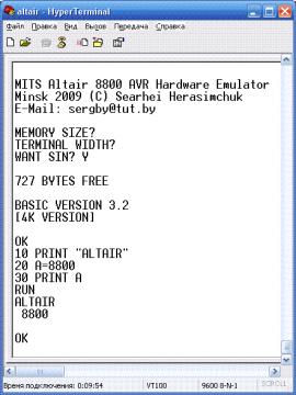 ). Девайс подключается к любому терминалу по RS232.Подчеркну, что AVR эмулирует не Baisic, а сам комп... точнее проц Intel 8080, RAM и плату SIO. На эмуляторе запущен оригинальный Baisic 3.2 Понятно что девайс сделан "Jast for fun" и посвящается всем любителям древних компов.