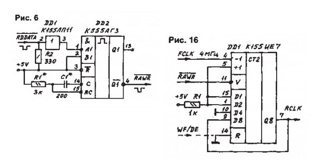 Схема выборки дисковода отсутсвует, этим экономится одна К555ТМ9 и одна К555ИД4. Сигнал выборки дисковода повесил на сигнал включения двигателя. А так за исключением схем на РТ4, эта схема содержит наименьшее количество ИС и наиболее упрощена ... |