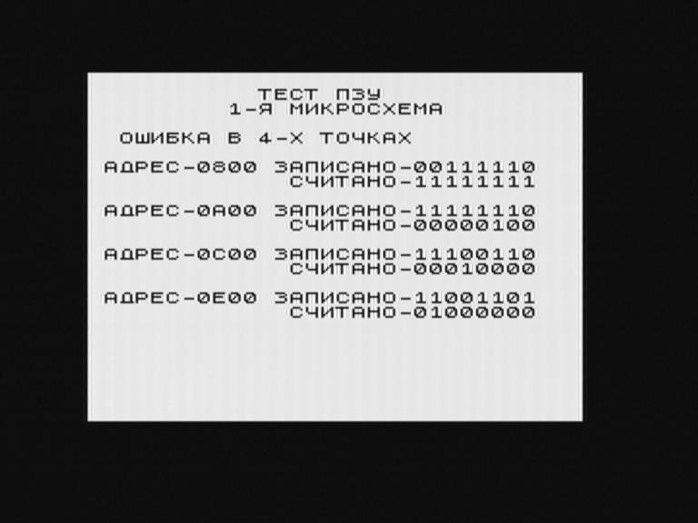 Прошивка тест для 48К машин. Может работать при неисправном ОЗУ. Тест состоит из 7 шагов. Между каждым шагом пауза - тонкие чёрно-белые линии на бордюре и высокочастотный свист. Шаг 1. Смена цветов бордюра от черного до белого. Шаг 2. Заполнение области атрибутов. Заполняется байтом #38 (чёрный по белому). На бордюре полоски (голубой/красный). Писк (~1130Гц). Шаг 3. Заполнение экранной области. Заполняется байтом #FF (чёрный). На бордюре полоски (чёрный/белый). Писк. Шаг 4. Заполнение экранной области. Заполняется байтом #00 (белый). На бордюре полоски (чёрный/белый). Писк. Шаг 5. "Тест буфера чтения данных" (выполняется моментально) Несколько попыток записи-чтения в ячейку ОЗУ с адресом #4000 различных значений ("бегущая 1", "бегущий 0"). Если всё в порядке выводится "БУФЕР ИСПРАВЕН", иначе выводятся записанное и считанное значения и чёрный бордюр на некоторое время (без звука). Шаг 6. Тест ОЗУ. Память 48К (#4000-#FFFF) заполняется, а затем проверяется. Так три раза с различными псевдослучайными комбинациями. (на экране три разных узора, бордюр белый, звука нет) Если всё в порядке выводится "ОЗУ ИСПРАВНО". Шаг 7. Тест ПЗУ. (выполняется моментально) (Видимо писался под компьютер с восемью(!) РФ2. Сам тест устанавливается вместо "нулевой" и проверяет 28 адресов (с #0800 по #3E00 с шагом #0200) на идентичность с оригинальной прошивкой 1982г. Есть второй этап - проверка контрольной суммы по своему "хитрому" алгоритму.) Если прошить вместе с оригинальным (1982г) BASICом (младшие 2Кб заменить этим тестом), то выдаст "ПЗУ ИСПРАВНО". Далее, возможно, следовал шаг 8 - Тест цвета В прошивке есть соответствующая надпись и названия цветов, но место, где должен располагаться код, забит #FF. После теста ПЗУ процессор выполняет случайные куски кода. (например, сначала очень долго "заполняет" пространство до #4000 кодом #07 - работает процедура, используемая в шаге 3 и 4) Шаги 2, 3 и 4 можно пропустить, если в конце первого шага держать нажатой клавишу space. -------------------- Если у кого нибудь есть ещё какие-нибудь тестовые прошивки с описанием, опубликуите пожалуйста. Last edited by DDp; 9th August 2007 at 14:39. |