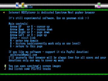 Люблю писать сетевой софт для спектрумов - вот добрался и до некста. Работает с его штатным вайфаем,пока доступен просмотр страниц, плоскотекста, прослушивание AY-музыки и просмотр скринов. В отличии от uGophy - история теперь работает не ...