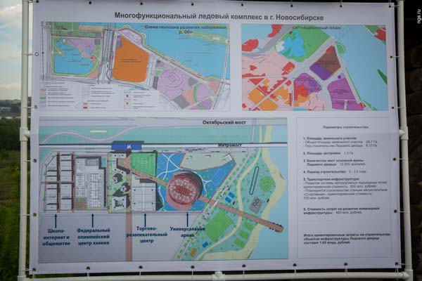 Как нам стало известно, изменения в городском ландшафте затронут всю береговую линию Оби от метромоста до Бугринского моста. Кроме самой ледовой арены на 12.5 тысяч мест на данном участке планируют разместить федеральный олимпийский центр хоккея с 4-мя катками, школу-интернат, общежитие для спортсменов и торгово-развлекательный центр. К спортивным объектам будет идти дорога, которая должна связать Бугринский, Октябрьский и запланированный 4-й мост, а на берегу Оби будет сделана набережная длиной 1,8 км. На участке в 18 га (ближе к Бугринскому мосту) в планах возвести футбольный стадион на 30 тыс. мест. Ожидается, что все объекты будут готовы к 2021 году.