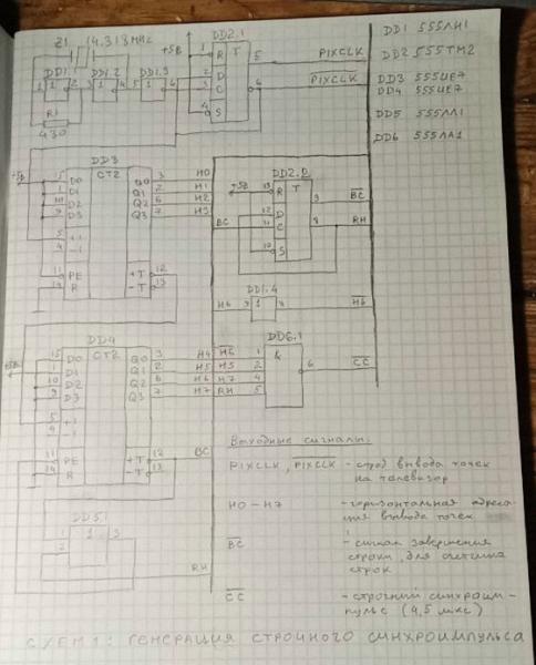 сейчас реализовал генерацию строчного синхроимпульса, причем я не хочу собирать "косяки" с длительностью сси например ленинграда, а попытаюсь сразу сделать правильно... для этого при генерации сси дополнительно к сигналам -H6 H7 RH был добавлен H5, и соответственно для операции И-НЕ потребовалась уже микросхема 555ЛА1 (4И-НЕ), в остальном генерация строк остается стандартной, и взята с конструкции ленинграда.