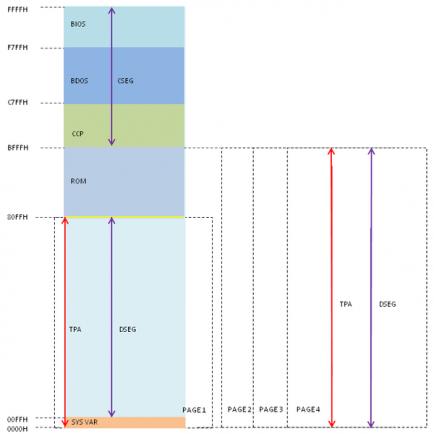Все линейное адресное пространство разбито на две условные области - свободно сменяемую и несменяемую. В несменяемой области, RAM, объемом около 16 килобайт, будет находиться все ср/м хозяйство. Ну, кроме разве что области SYS VAR, которая размещается в самых нижних адресах памяти. Свободно сменяемая память физически состоит из 4 страниц, примерно по 48 килобайт каждая. Страница PAGE 1 содержит RAM, объемом 32 килобайта, смещенную в адресном пространстве на область SYS VAR, и ROM объемом 16 килобайт, с программой начального пуска и сетевой загрузки cp/m в несменяемую область RAM. Страницы PAGE 2 - PAGE 4 являются RAM с объемом 48 килобайт каждая. Оперировать ими будет cp/m.