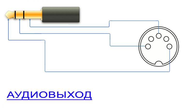 Прилагаю также распайку проводов: Видеовыход - DIN7 на SCART (проверено на телевизоре, который поддерживает RGB через SCART), Аудиовыход - DIN5 на MiniJACK (можно загружаться с плеера или с любого достаточно громкого источника звука)