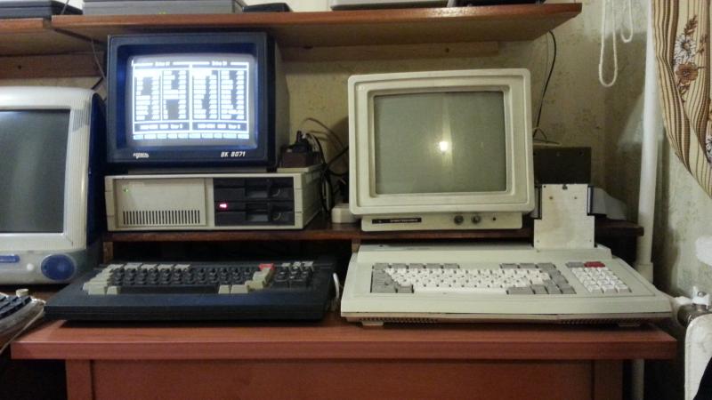 А теперь я помучался с Корветом. Пришли два дисковода - Электроника 5311 и 5313. Первый - как есть, второй собран из двух, у него мотор слишком быстро крутился, я поставил в него привод от 5305. Сначала я проверил их на УКНЦ. Худо-бедно работают, хотя и далеко не идеально. Но по-крайней мере, загрузка с них идёт. Подключаю их к Корвету. Пока они лежат на столе отдельно. Что-то плоховато с загрузкой - на 5313 через раз, на 5311 с пятой попытки. Почистил им головки, вставил их в ВБ (вспомогательный блок), всё собрал. Включаю - Бейсик и всё, хоть тресни. Сколько ни жал Reset, так СР/М и не увидел. Менял буквы у дисководов, оставлял по одному - всё равно Бейсик. Потом я обнаруживаю, что в дисководе у меня стоит загрузочная дискета от УКНЦ... Стучу себя по лбу :) В процессе изысканий на каком-то этапе произошла подмена дискеты. Втыкаю корветовскую - ура, есть загрузка! С нижнего дисковода, 5313. Несколько раз перезагружаю - грузится. Ну, раз он надежнее, меняю дисководы местами, ставлю 5313 наверх. Собираю, включаю - на дисководе загорается лампочка - и тишина, даже диск не крутится. Подключаю их к УКНЦ (питаются они от корветовского ВБ). Работают. Неудобно каждый раз снимать монитор, отключать, подключать его. Поставил монитор вниз, а ВБ на него. Всё грузится, оба дисковода работают, хотя бы список файлов открывается. Игрушка с В запустилась. Ставлю обратно - ВБ вниз, монитор на него. И опять - дисковод пошуршит, и тишина. Ни Бейсика, ни СР/М-а. Отключаю монитор, перезагружаю. По звукам слышу, что система загрузилась. Втыкаю питание монитора, компьютер сбрасывается. Приподнимаю монитор, оттаскиваю его, насколько хватает проводов - ничего не меняется. Меняю родной корветовский монитор на "Колокольчик" - то же самое. Но у него провода подлиннее, я ставлю его рядом. Всё заработало! Держу монитор на руках над ВБ - если поднять его сантиметров на 15, всё работает. 5 см - уже не работает. Если после начала загрузки, появления надписей НИИЯФ и т.д., но до появления "А:>" опустить монитор, появляется сообщение BDOS ERROR.
