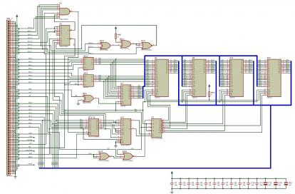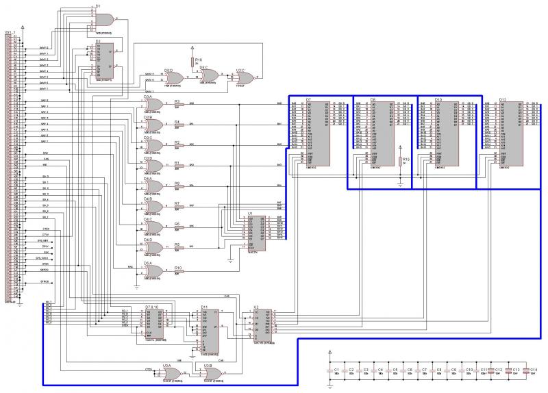 Всё сделано чисто на логике, никаких ПЛИСов, никакой прошивки или наладки, по идее, не требуется. Ориентируясь на схему квазидиска из Вектор-Юзера №18, заменил триггеры ТМ2 на ТМ9, что сократило число микросхем. Также получилось избавится от ПЗУ-хи, немного сократить число чипов в обвязке. Но нужно ещё тщательно проверить схему, в том числе на задержки в чипах, поэтому прошу знающих людей посмотреть/покритиковать/предложить... :)