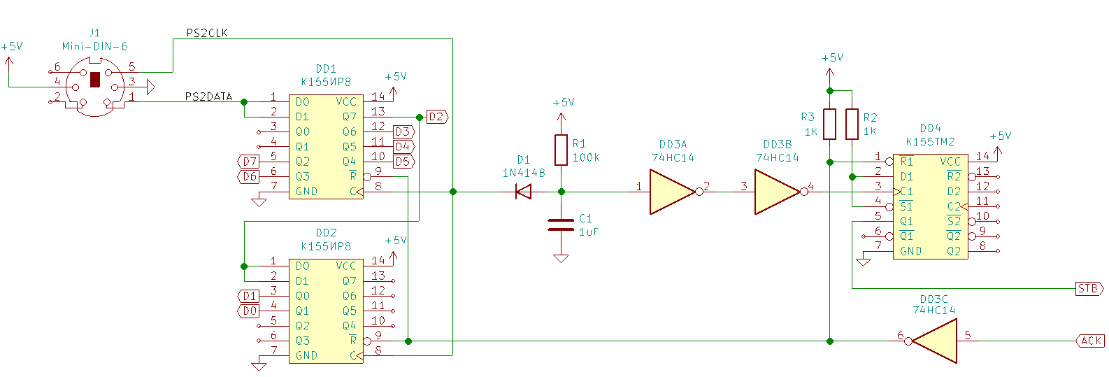 Четвертый вариант - разновидность первого, авторства rw6hrm. Он (вариант) с меньшим количеством микросхем, но с большим количеством транзисторов, на радость любителям сладкой парочки КТ315/КТ361: https://qsl.net/rw6hrm/html/ascii_kbrd2.htm