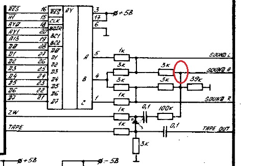 Стерео AY звучит громко и хорошо. Бипер уже потише и равен громкости полного звукового сигнала со всех каналов. А с ковокса совсем негромко по сравнению со стерео при подключении в отмеченную точку.