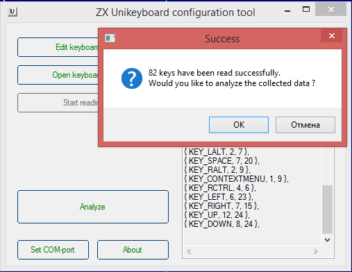 Как предлагал Eltaron, реализована идея обучаемости схемы. То есть изначально в атмегу заливается обучающая прошивка (она же известна как "тестовая"), которая через компорт при помощи "специальной программы" (скриптик на autoit3) транслирует номера линий нажатых клавиш. Когда опрошена вся клавиатура и получены для каждого клавишного имени ее матричные координаты, строится описание массива клавиш, которое затем компилируется вместе с исходником "рабочей" прошивки. С ней контроллер уже используется на Спеке.