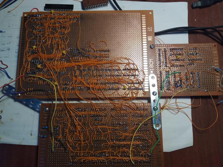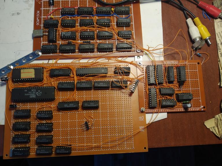Решил создать клон по своей схеме. Главная задача это компьютер с общим полем памяти и использование SRAM и только стандартные микросхемы логики. Машина должна иметь "правильный" видеовыход, например компонентный (YPbPr), и еще несколько полезных фишек, над которыми надо еще работать. Первый более менее удачный запуск и внешний вид франкенштейна на картинках.