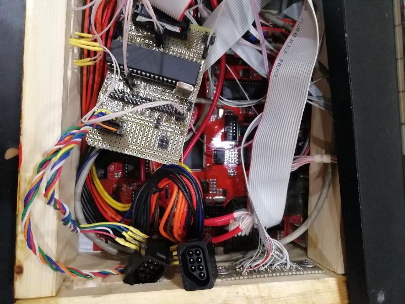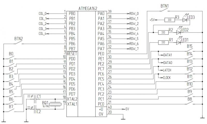 К порту D и C ATMega подключаем самодельный геймпад (с каждой кнопки выведены 2 провода – один на пин порта D или C, другой на землю). Таким образом можно подключить до 16 кнопок (обозначение их на схеме B0-B15) самодельного геймпада. Я сделал себе 2 геймпада – один сеговский (12 кнопок), другой дендевский (8 кнопок). Можно подключить оба, если на сеговском выкинуть 4 кнопки. Тут кому как нравится.