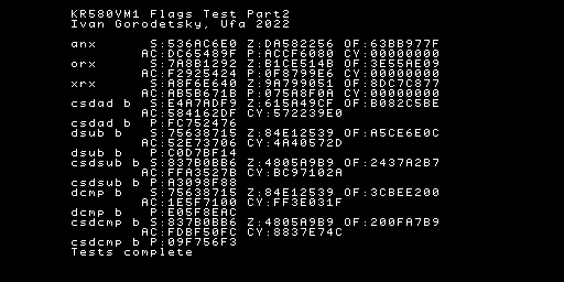 Дополнение про первый тест. Для тех команд флаг полупереноса ВМ1 полностью совпадает с 8080 и для 8080 в Emu этот флаг реализован идеально, т.е. тут достаточно перенести реализацию этого флага в ВМ1.