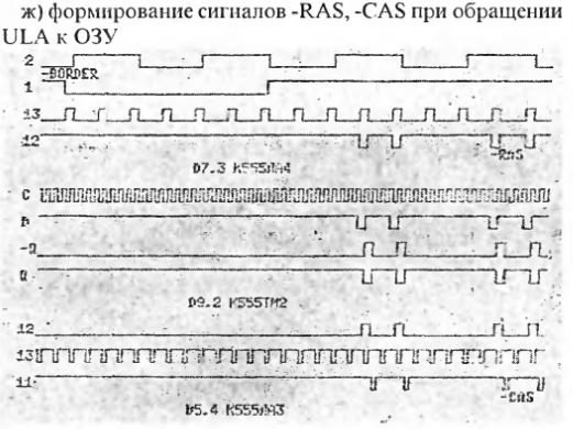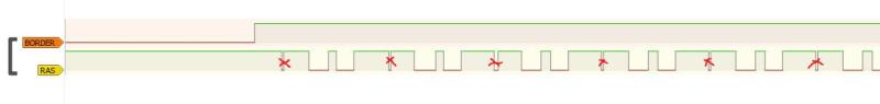 Начал перепроверять сигналы на ОЗУ и возник ламерский вопрос. На сколько я понимаю, во время рисования строки, ВК должен 64 раза обратиться к ОЗУ - прочитать 32 байта пикселей и 32 байта аттрибутов. Я же вижу только 32 пульса RAS. Причем то, что я вижу, очень похоже на временную диаграмму RAS Львова, которая схематически практически идентична с Оризоном. Выглядит так: Вложение 78908