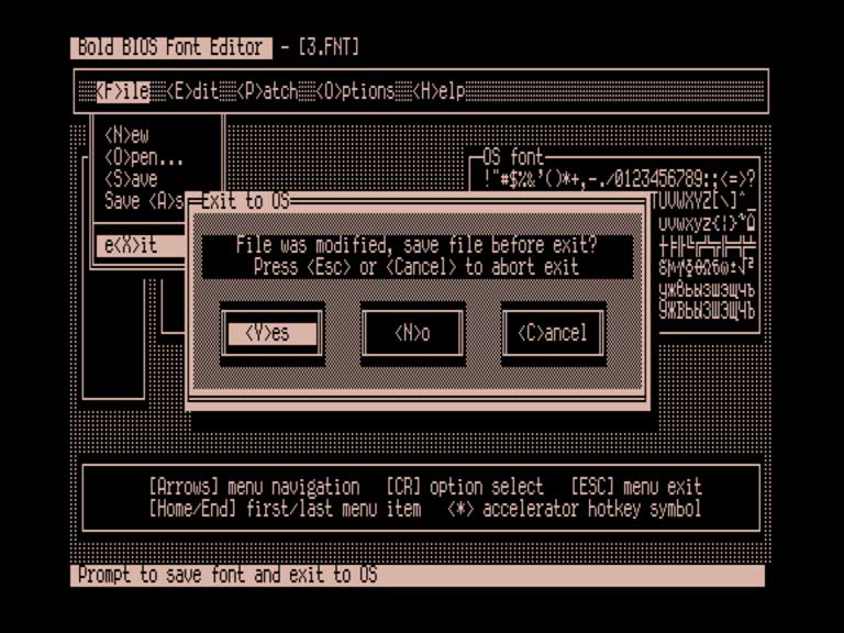 Так как я начал с имеющегося кода с 90х, выбор С компилятора - не самый удачный. Это SuperSoft C, даже не K&R и оптимизировать генерируемый им код - постоянный вызов. С другой стороны, я обожаю недокомпиляторы и перспективу впихивать невпихуемое. Как вышло - судить вам. Весь исходный код прилагается в аттаче. Там же образ дискеты fonted.fdd. Чтобы запустить редактор шрифтов, просто смонтируйте в эмуле на приводе A, загрузитесь и нажмите <ВК>. На диске есть несколько разных видов шрифтов для примера. Их можно загружать в редактор а потом в ОС. Также можно сгенерить ОС с новым шрифтом