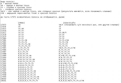 0й такт. Захват прерывания происходит на последнем такте команды предыдущего кадра. Но, чтобы он был захвачен, импульс прерывания должен начаться ещё раньше, на предпоследнем такте команды. Т.е. самым первым тактом кадра, при программном выравнивании на начало кадра, фактически является предпоследний такт предыдущей команды. Поэтому, если такты нового кадра в эмуляторе нумеруются с начала цикла подтверждения прерывания, начиная с нулевого (а это практически стандарт), дальнейшие значения нужно уменьшать на 2.