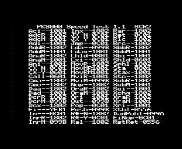 Заранее могу сказать, что результаты в SCR0 и недокументированном (который полностью или частично совпадает со SCR0) режимах скорее всего будут с "нецелыми" тактами из за разного торможения при выводе разных частей экрана (в отличие от SCR1/2), т.е. это будет "среднее время выполнения команды в течении кадра". Чтобы точно определить по отдельности время выполнения команд в этих режимах на бордюре и в активной области нужен, например, таймер, синхронно работающий с процом, но его нет.