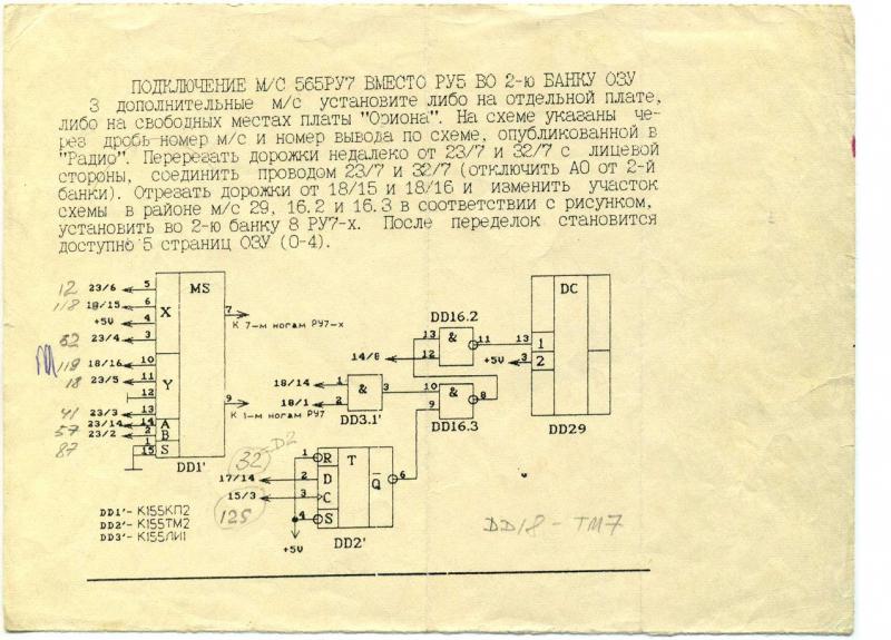 Надо чтобы по /RAS шли самые высокочастотные адреса видеогенератора, а в ОРИОНЕ это сигналы H0...H5,V0,V1. После добавления нового мультиплексора на 9-й адресный вход РУ7-мых, туда надо заводить следующий по высокочастотности сигнал, а это V2 (52 цепь). Для этого эта 52 цепь отрезается от D23/4 и подаётся на дополнительный мультиплексор на ногу 3, а соответствующий адрес CPU (A2) цепь 12 идёт на ногу 5. А на место отрезанной от D23/4 цепи 52 подаём сигнал B1 (для РУ7 это A17). Также необходимо отрезать вход D29/3 и подать туда 1.
