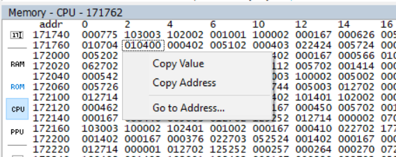 * Memory: текущий адрес, контекстное меню, копирование адреса и значения в буфер обмера.