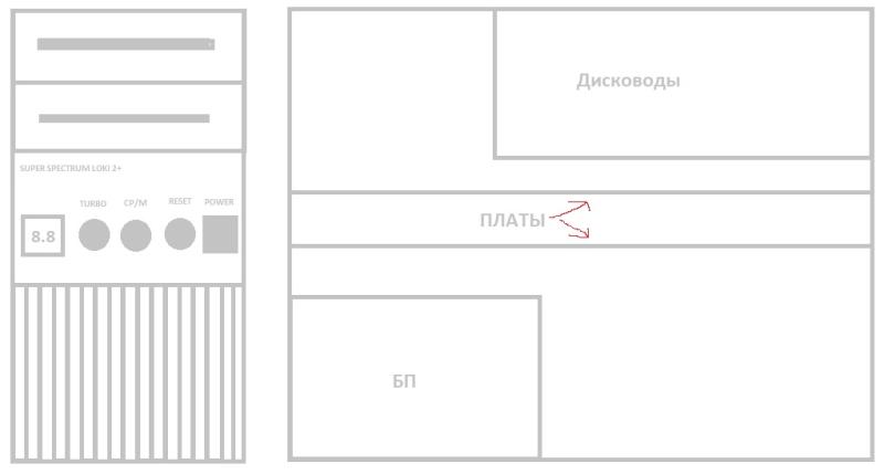 Корпус был типа tower, серого цвета, весь металлический включая морду. Металл капитально добротный, производство явно заводское. Но это был не PCшный корпус. Похоже, что он был спроектирован именно под этот комп.
