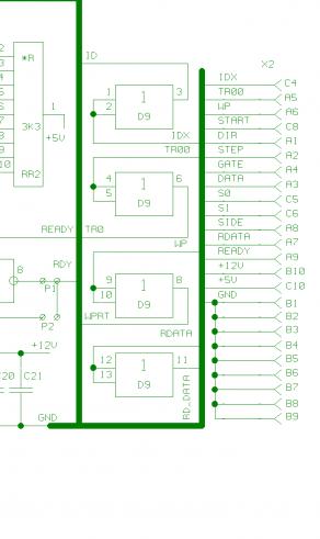 Должно быть наоборот выв.8 D2/9.3 к выв.36 D2/4, а выв. 9 и 10 к сигналу WP дисковода.