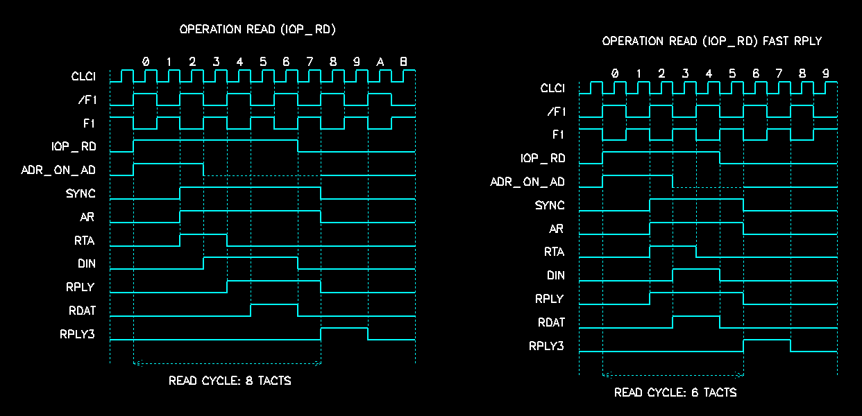 Например, нарисовал, что минимальный цикл чтения занимает 8 тактов. Стал искать лазейки, и выяснил, что если подать упреждающий RPLY синхронный с SYNC, то цикл можно сократить до 6 тактов. Не знаю, хак это или штатно так положено. И вообще, промоделировать такое не могу, может только владелец модели @Vslav. Но как тема для размышления - интересная.