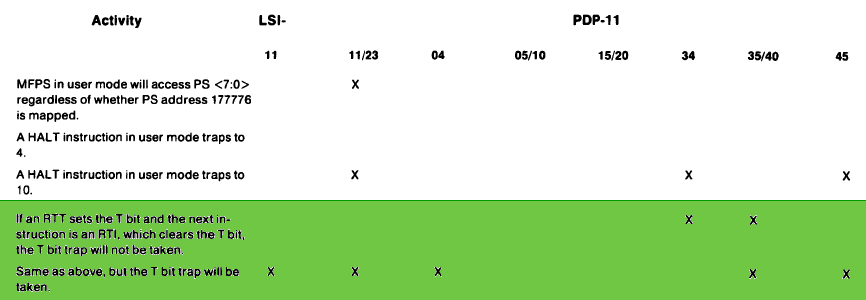 При выполнении последовательности команд RTT, каждая из которых устанавливает бит T - процессор 1801ВМ1 полностью блокирует прерывания и выполняет первый T-trap только через одну команду после завершения последовательности.