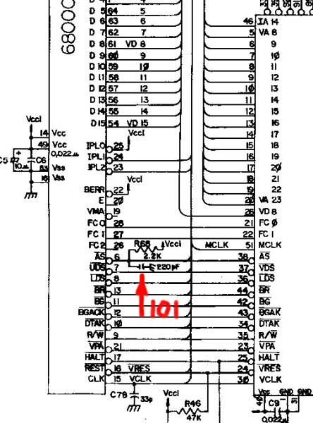 Между прочим! Два дня назад приносили лицензионную азиатку. Вырвали гнезда джойстиков + жаловались что иногда виснет. Ну я джои починил а висячка реально: то Векторман на заставке встанет, то мой плешкарт даже не бутится. Причем с рассыпанием графики. Сначала я думал непропай - графика сыпалась от касания видеопамяти. Пропаял - сыпаться перестало но висло. Думаю надо померить DTACK, а мерить его надо от AS по VCLK. Цепляю осцилл - а там бардак (фронты завалены) но работает! Не сразу врубился, оказалось когда на AS встаешь - не виснет. Нашел на плате место под этот кондер, впаял 100 пикушек и все! И тут я вспоминаю тему на Спрайтесмайнде про UMDK, где без задержки AS все глючит на ранних моделях. И понимаю зачем туда кондерчик впаяли...