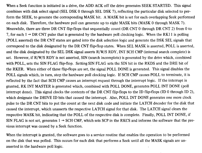 Это самое хорошее описание, но я не просто так дал ссылку на попытку реализации этого описания в ПЛИС, результат которой описан так: "RK11: hardware poll not working. The RK11/RK05 hardware poll logic is probably no reflecting the behaviour of the real drive."