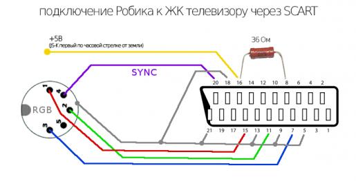 Попробовал подключить через СКАРТ. После долгих мучений получилось у меня такое (извиняйте за кривую схему, рисовал как мог)