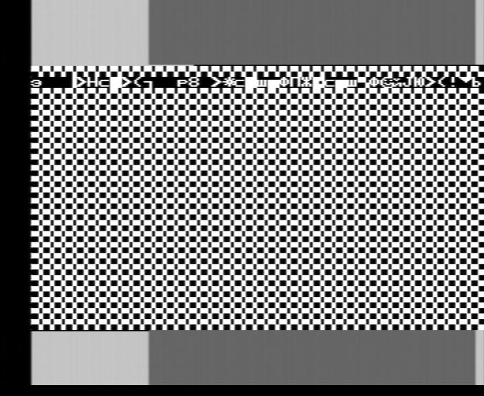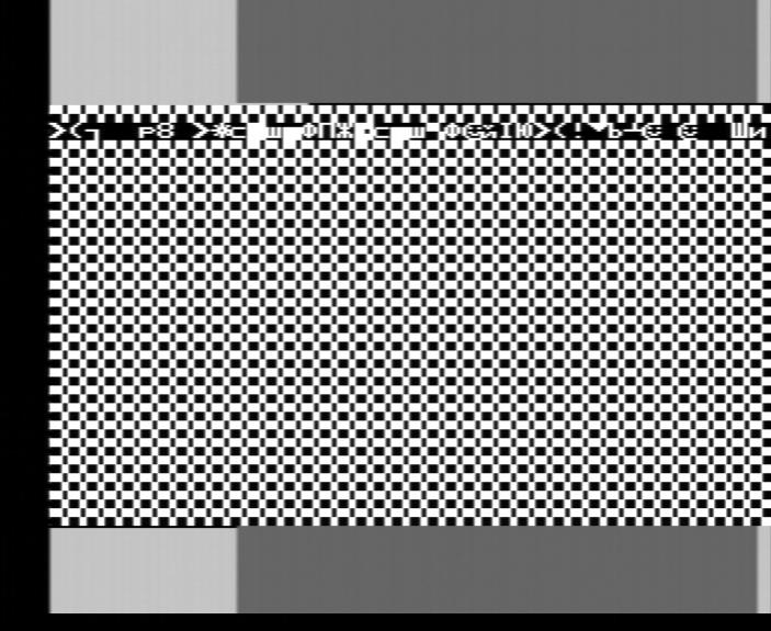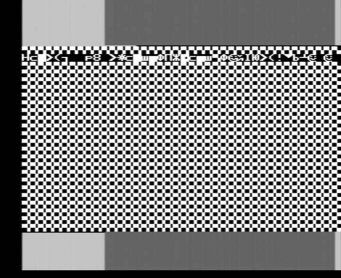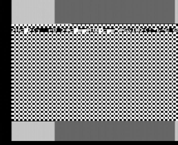 Черная полоска закончилась под Г (она высотой в одну строку, поэтому надо вглядеться), т.е. 8 символьных позиций от начала активной области строки. 8 (в данном случае думаю не 4) тактов от HLT+20 тактов RST+20 тактов OUT=48 тактов/4 такта на символ=12 символьных позиций от момента прихода прерывания. Т.е. если я ничего не забыл, то запрос прерывания становится активен где-то за 16 тактов до начала отображения активной области первой строки нижнего бордюра.