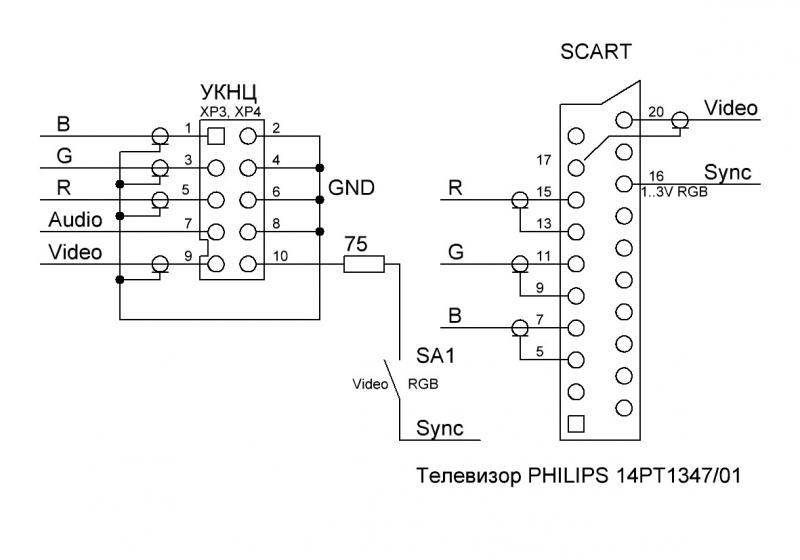 Video с 20 контакта на 16 в SCART и с 9 на 10 в УКНЦ. Синхронизация