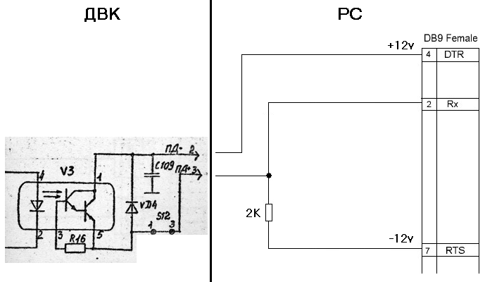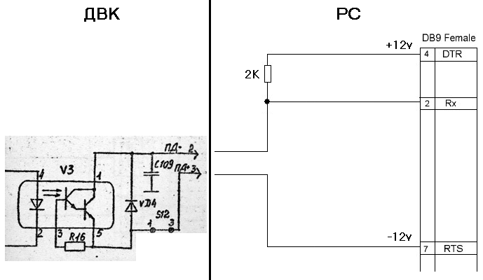 2. Определить режим передачи - прямой или инверсный. Для этого подключить "+" омметра к линии ПД-, а "-" омметра к линии ПД+. Убедиться ( на пределе измерений 20К ), что при выключенном питании ДВК цепь разорвана и включить питание ДВК. Если сопротивление упадёт до 100 Ом - передача прямая, если цепь останется разорванной - передача инверсная.