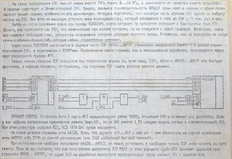 Djoni, и кому интересно, да бы до конца понять как работает вышеприведенная турборам, посмотрите левую часть этой схемы, она отключает озу и регистр буфера шины данных D39 на время обращения к турборам #8000-#BFFF