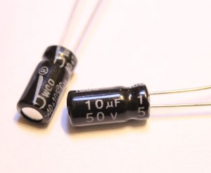 10uf напряжение от 10V и у этих конденсаторов есть плюс и минус и нужно правильно припаять.