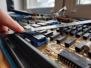 От дна линейки до верхушки процессора ~5.5 мм. От дна линейки до верхней части колодки, куда вставлен процессор, ~8.6 мм. Если на переходной плате процессор будет впаян, то всё должно поместиться. Единственный момент, это аксиальные конденсаторы, которые чуть выше, чем процессорная колодка. Колодка возвышается над платой на 6.5 мм, а конденсаторы на 7.6 мм.