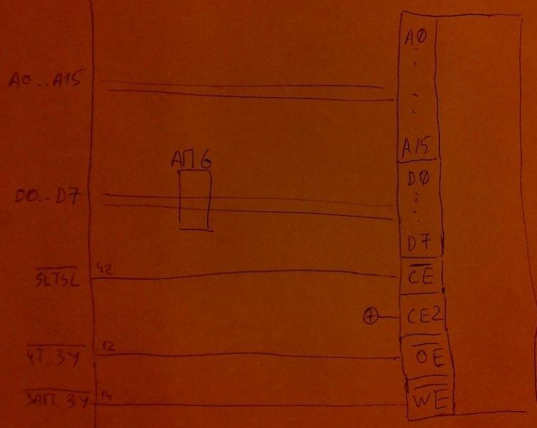 DemonId7, ты можешь попытаться подрубить SRAMину? Тогда посмотри в теме про квазидиск схему Micka. Оттуда можно все убрать и оставить 2 вещи: SRAM, лучше на 64 Кб (тогда тест пойдет почти без переделок), но, в крайнем случае, можно и на 32 или даже 16, и АП6. На /CS SRAMа подавать /SLTSL (у Micka он почему-то написан без /, хотя в доках у этого сигнала низкий активный уровень)