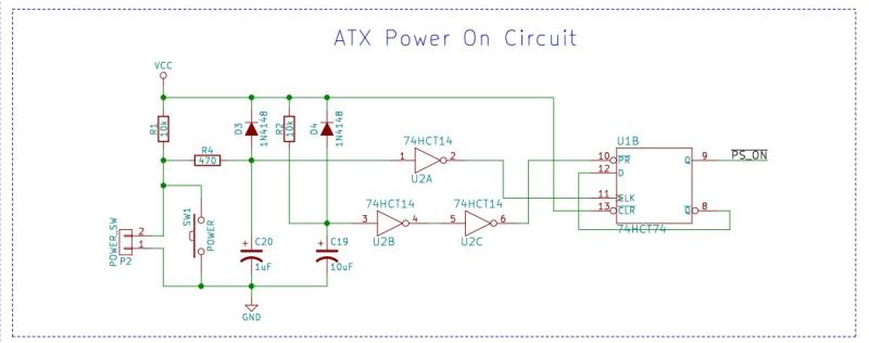 отпускаем кнопку, C1 разряжается через R2. жмем кнопку - транзистор закрывается, бп выключается. с PG прилетает 0, держит транзистор закрытым. отпускаем кнопку, идем в начало цикла.