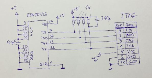 На сайте Intel написано, что при работе с микросхемами MAX3000A высокое напряжение на выводе OE не используется. Оно используется только для отключения JTAG, после чего вся операции с ними выполняются в Serial режиме.