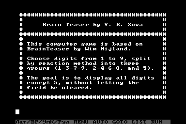 Эта компьютерная игра основана на «BrainTeaser» от Wim Nijland. Выбирайте доступные цифры от «1» до «9», разделяющиеся по методу реагирования на три группы («1-3-7-9», «2-4-6-8» и «5»). Цель — отобразить все цифры, кроме «5». Только следите, чтобы поле полностью не очистилось.