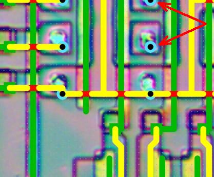 Но тут мы все видим глазками, все глюки можно выловить. Главное, что я со схемой разобрался, долго искал ошибку в Верилоге, потом решил-таки что пропущена где-то цепь, подсветил две подозреваемые, на топологии они высветились - опа, а вот тут перекресток у них есть, смотрим фотку - а там нет транзистора, бинго.