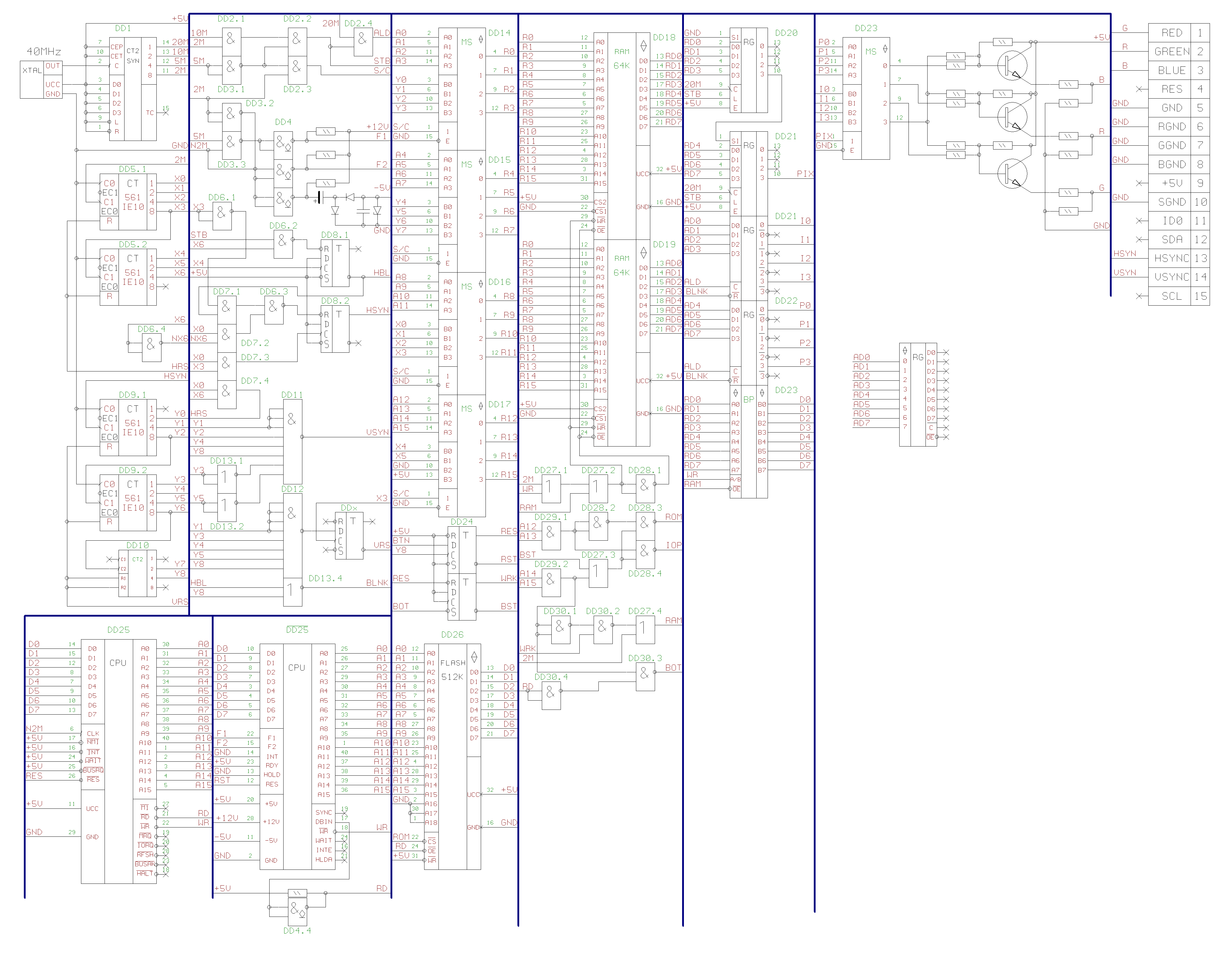 Пол компьютера готово. Сейчас оттачиваются тайминги. Предварительная схема. А вот видео работы. В начале тёмный экран - меняется ПЗУ.