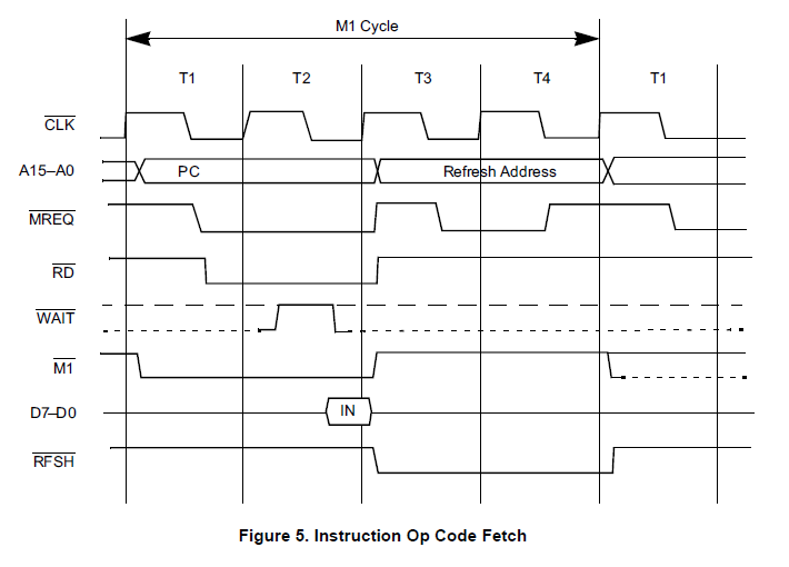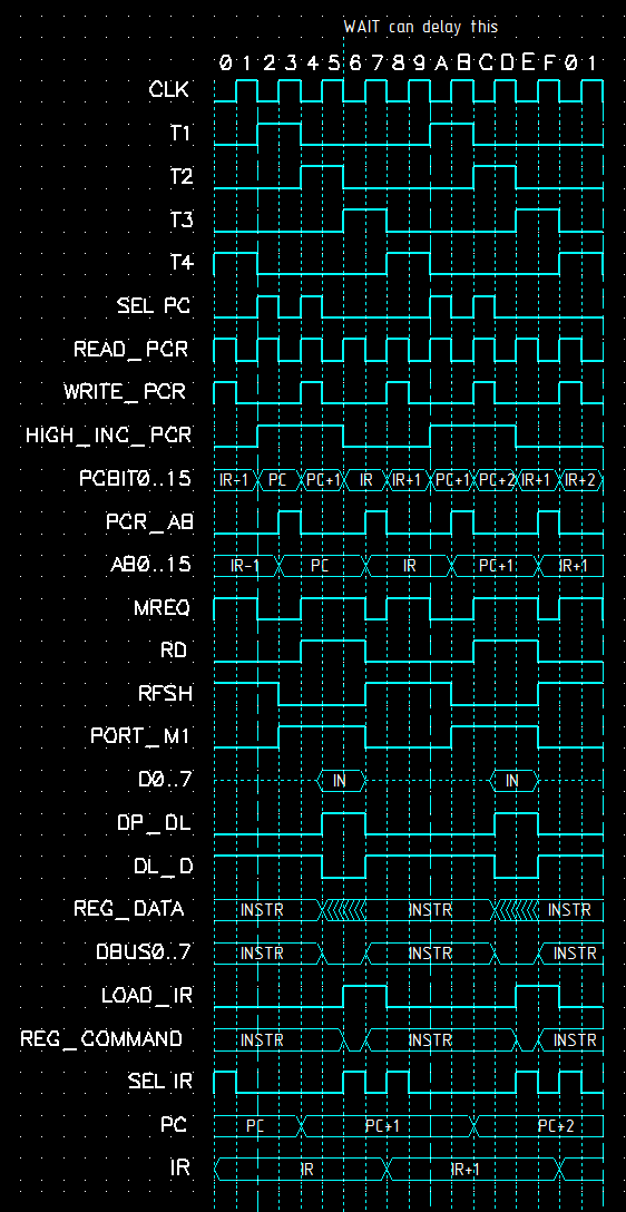 Замечу, что даже основные циклы не совсем совпадают с фирменной документацией по Z80. А именно - циклы T1-T4 смещены на пол-такта: