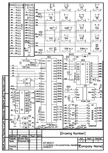 Клавиатура, индикация на светодиодах, формирование тактового сигнала на 580ВВ51, формирование импульсов прерываний и интерфейс с ЖКИ индикатором собраны на PIC16C74 - микроконтроллере с доступом по процессорной шине. Процессор компьютера обращается к нему на чтение по адресу А0Н, по записи - по адресам 90Н-97Н. Фиксация адреса обращения при записи и типа обращения (память или IO) выполнена на D2.