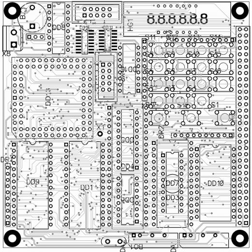 Плата 10х10см, на плате индикатор, клавиатура, ОЗУ 64к, ПЗУ 8К, процессор, ПЛИС(EPM7128), шинные формирователи, преобразователи напряжения, разъём расширения.