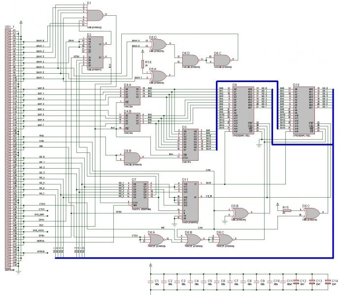 В прошедшие выходные посмотрел в инете доступность в продаже микросхем памяти, и оказалось, что те, которые я планировал вначале можно либо купить в китае либо задёшево б/у с ~10% вероятностью брака, либо дороже, чем в России (в том же "Чипе и Дипе") аналогичные, но с ёмкостью в два раза больше... В общем, на этой волне перерисовал схему: