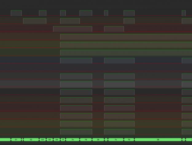 Затем, после выполнения JMP 0xF800, на шине черт-те что: FF7F, FF7E, FF7D, 0038, FF7D, FF7C, FF7B, 0038, FF7B, FF7A, FF79, ...