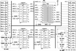Нижние 2 вывода разъема УКНЦ - имеющиеся дорожки отрезать и приделать соответственно сигналы ЦП 1801ВМ2 EVNT и IAKO ВМ2, но они в стандартном включении корзинки не используются.